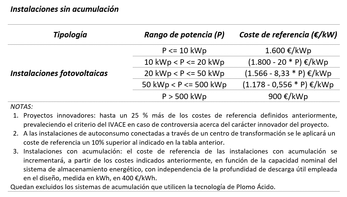 Costes de referencia. Se tomará una inversión máxima por unidad de potencia a instalar incluyendo todos los componentes, equipos e instalaciones, así como la tramitación del proyecto para su legalización, según las características de cada proyecto (ver cuadro)