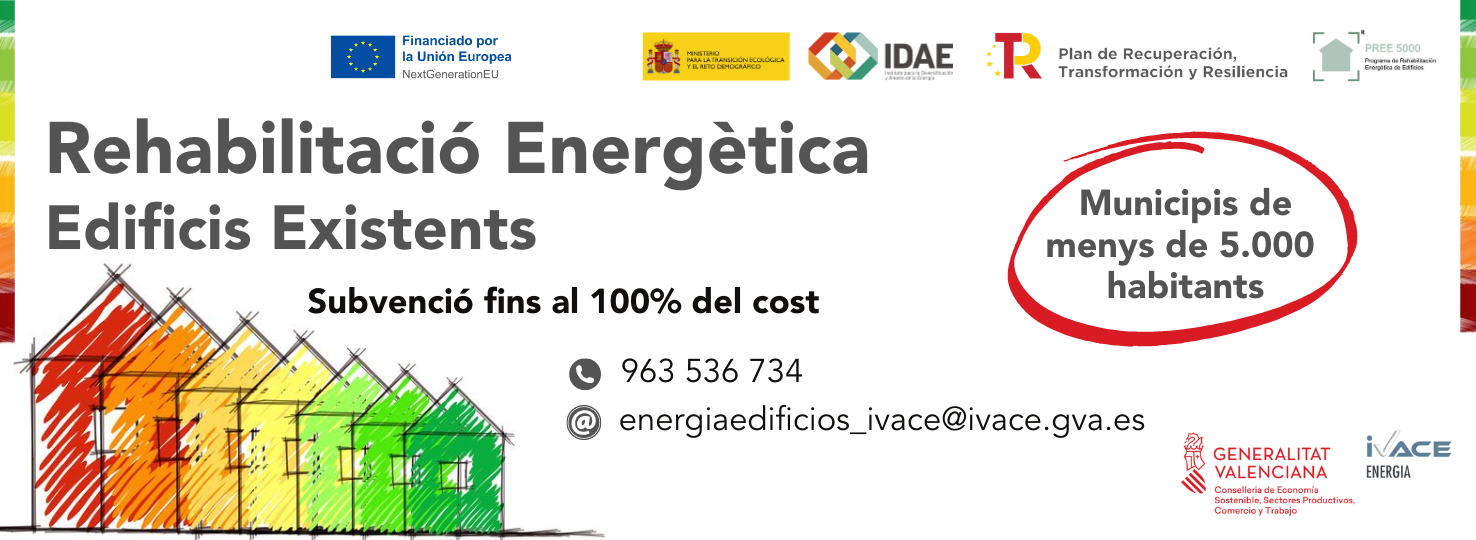 * A continuació es descriuen breument les característiques principals d'aquest programa d'ajudes, si bé la informació que es considerarà com a oficial amb caràcter general serà la publicada en la Resolució de 21 de gener de 2022, del president de l'Institut Valencià de Competitivitat Empresarial (IVACE), per la qual es convoquen ajudes per a actuacions de rehabilitació energètica en edificis existents (Programa PREE 5000 - Comunitat Valenciana), inclòs en el Pla de Recuperació, Transformació i Resiliència, amb càrrec al pressupost de l'exercici 2021. (DOGV nº 9265 de 27/01/2022), i posteriors ampliacions de pressupost (DOGV nº 9607 de 31/05/2023) i (DOGV nº 9884 de 03/07/2024)
