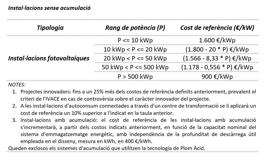 Costos de referència. Es prendrà una inversió màxima per unitat de potència a instal·lar, incloent-hi tots els components, equips i instal·lacions, així com la tramitació del projecte per a la seua legalització, segons les característiques de cada projecte (vegeu quadre)