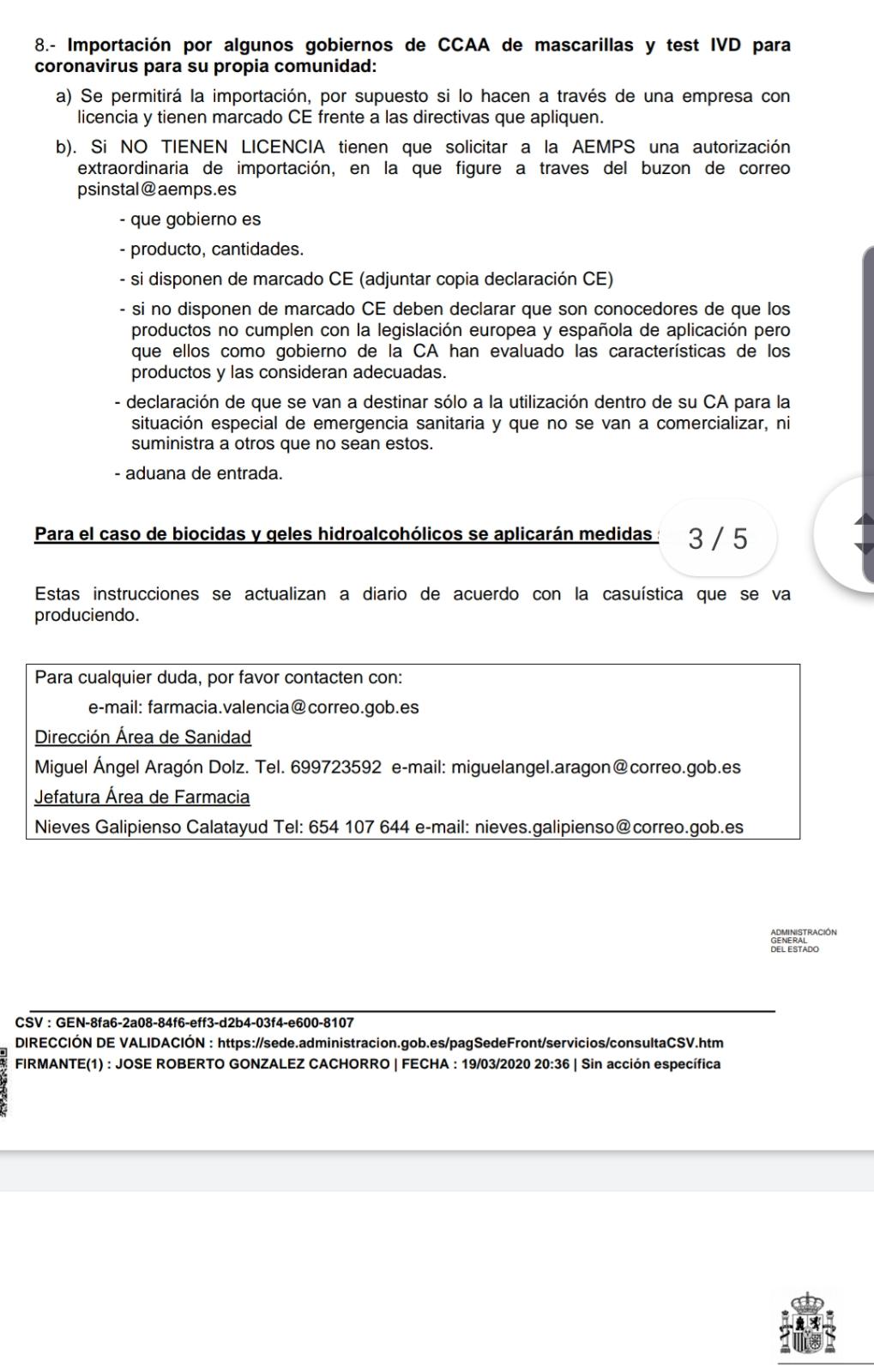 Aquesta és la nota interpretativa de la delegació del govern en la Comunitat Valenciana respecte a l'Ordre SND/233/2020, de 15 de març, per la qual s'estableixen determinades obligacions d'informació d'acord amb el que es preveu en el Reial decret 463/2020, de 14 de març, pel qual es declara l'estat d'alarma per a la gestió de la situació de crisi sanitària ocasionada pel COVID-19. En ella es s'exposa clarament que l'objecte de l'ordre no és confiscar ni requisar material, sinó informar del material disponible per a conéixer l'estoc que hi ha en tot el territori espanyol. (vegeu nota) (20/03/20)