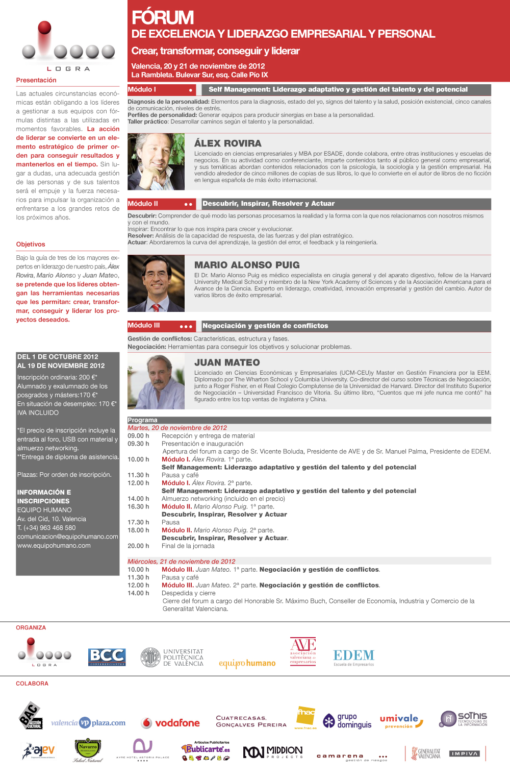 El Fòrum es dividix en tres grans mòduls. En el primer, Álex Rovira aportarà la clau sobre com tractar el ser humà en el seu mòdul “Self Management. Lideratge adaptatiu i gestió del talent i del potencial”. El segon “Descobrir, Inspirar, Resoldre i Actuar”, a càrrec de Mario Alonso Puig, abordarà la corba de l'aprenentatge, la gestió de l'error, el feedback i la reenginyeria. I en el tercer mòdul, Juan Mateo, recorrerà les diferents fases del procés de “Negociació i gestió de conflictes”.
